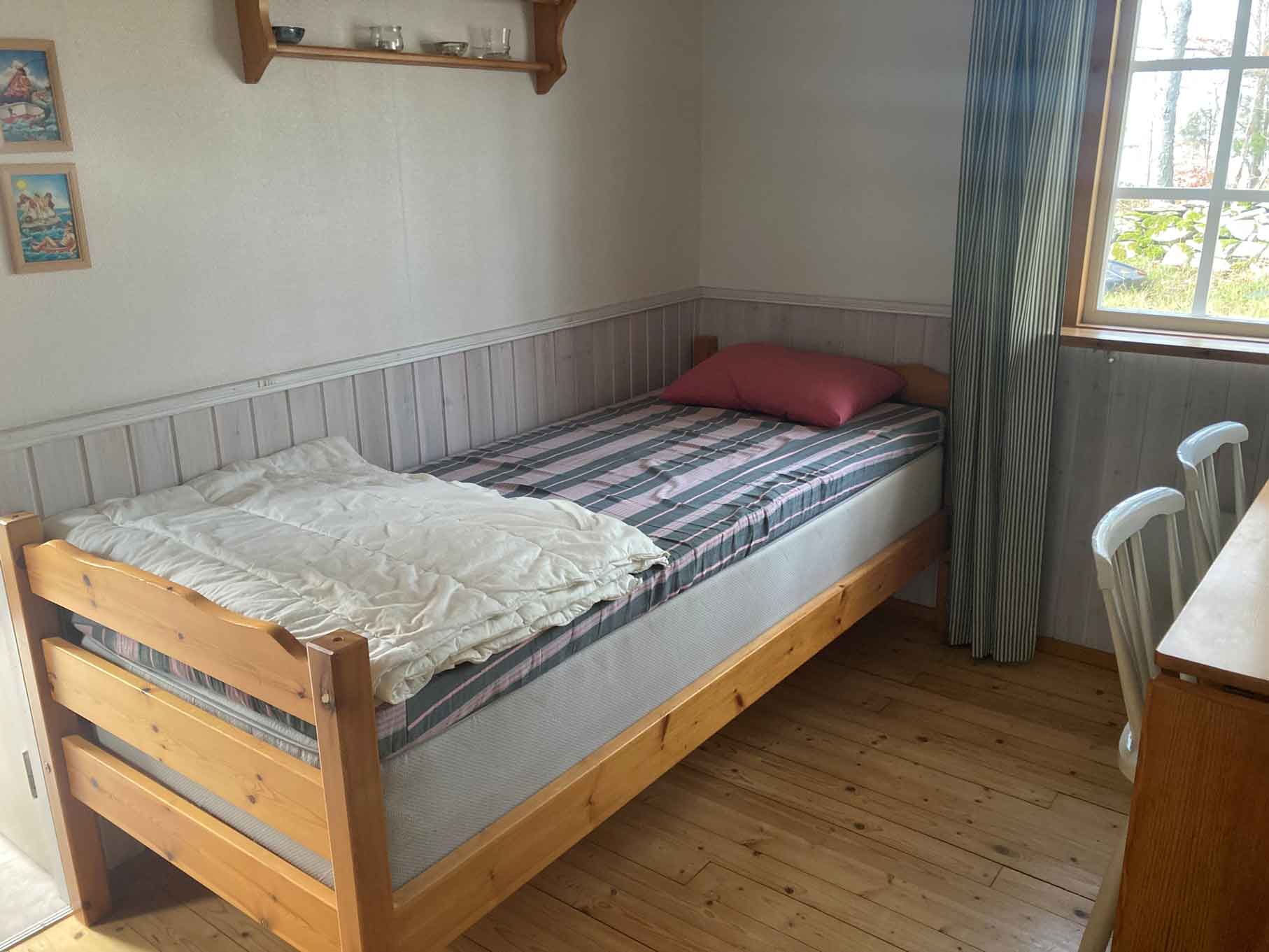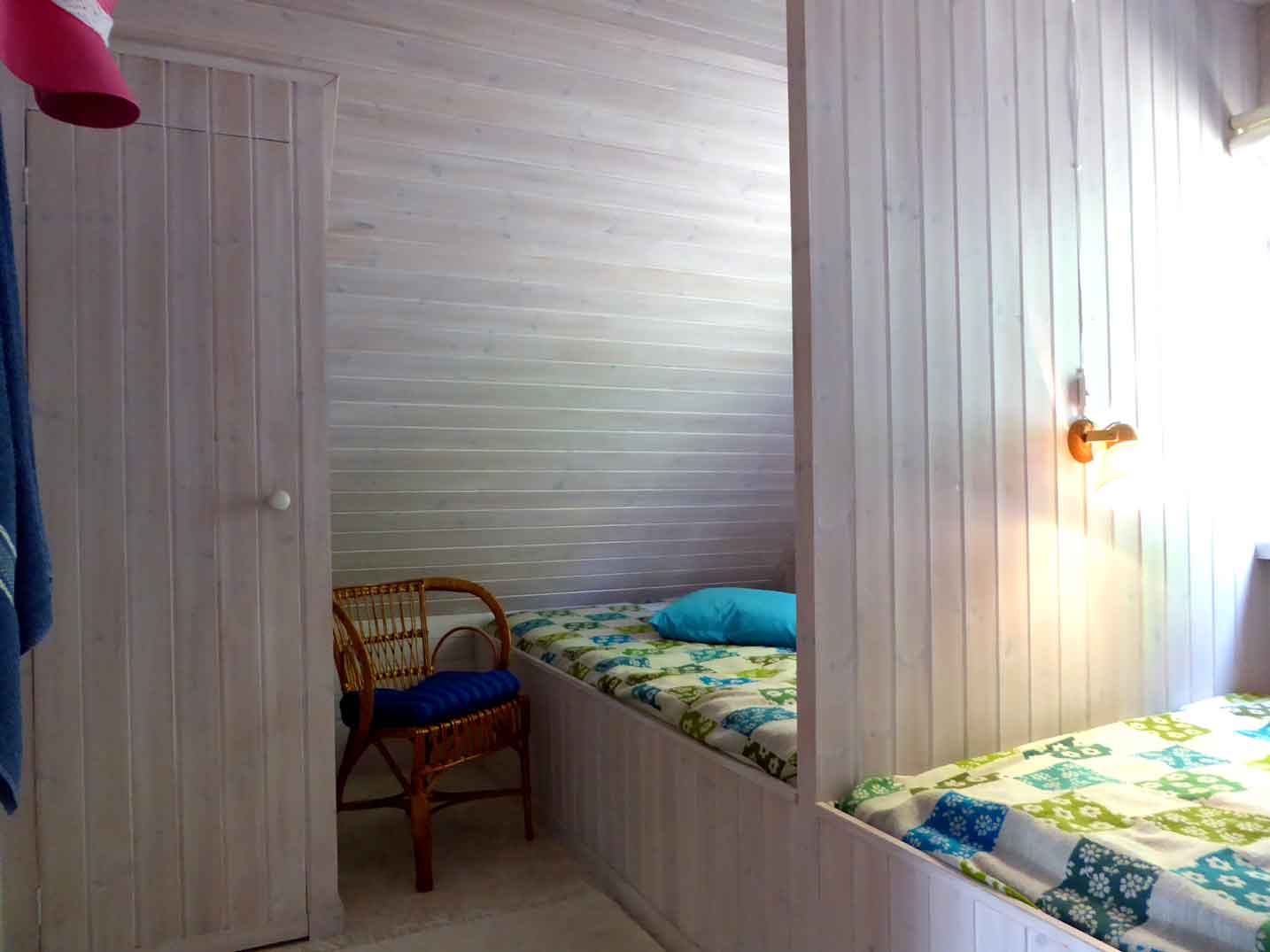 Huset och tomten Huset är 40 m² och har: - 1 sovrum med skiljevägg med två dubbelmadrasser 140 cm (4 bäddar) och en enkel säng 80 cm i allrummet (1 bädd) - Vardagsrum/allrum har soffa och tv med utländska satellitkanaler och välutrustat kök i öppen planlösning. - Toalett och dusch finnes i en närliggande sidobyggnad/anex. Vattnet kommer från en egen brunn.